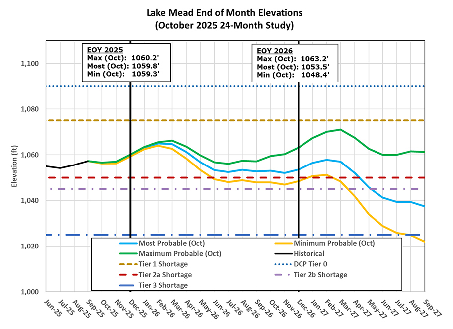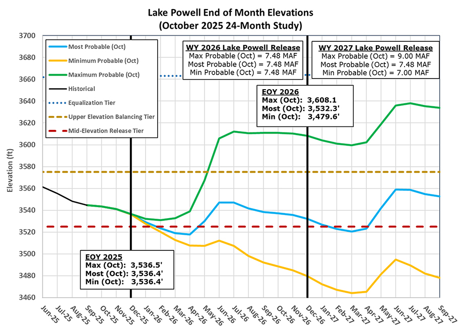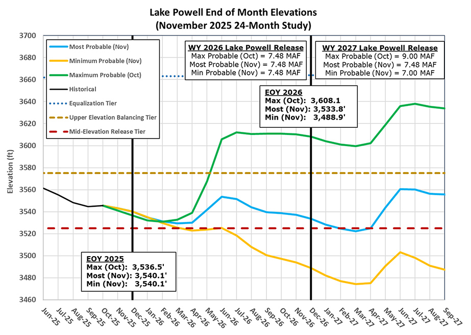 The 24-Month Study, issued by the Bureau of Reclamation, projects future conditions in the Colorado River system extending out 24 months. The Minimum, Most, and Maximum probable elevations are determined using the 90%, 50%, and 10% probable exceedance of unregulated inflow forecasts from the Colorado Basin River Forecast Center, projected reservoir operations as determined by existing policies, and projected water demand schedules.