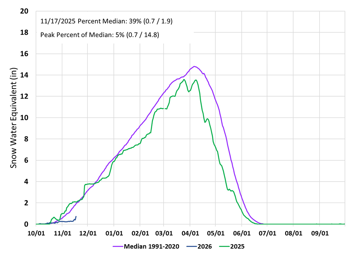 For the overall Colorado River Basin above Lake Powell, the snow accumulation as of 11/17/2025 is at 0.7 in., which is 39% of the 30-year median for this date of 1.9 in