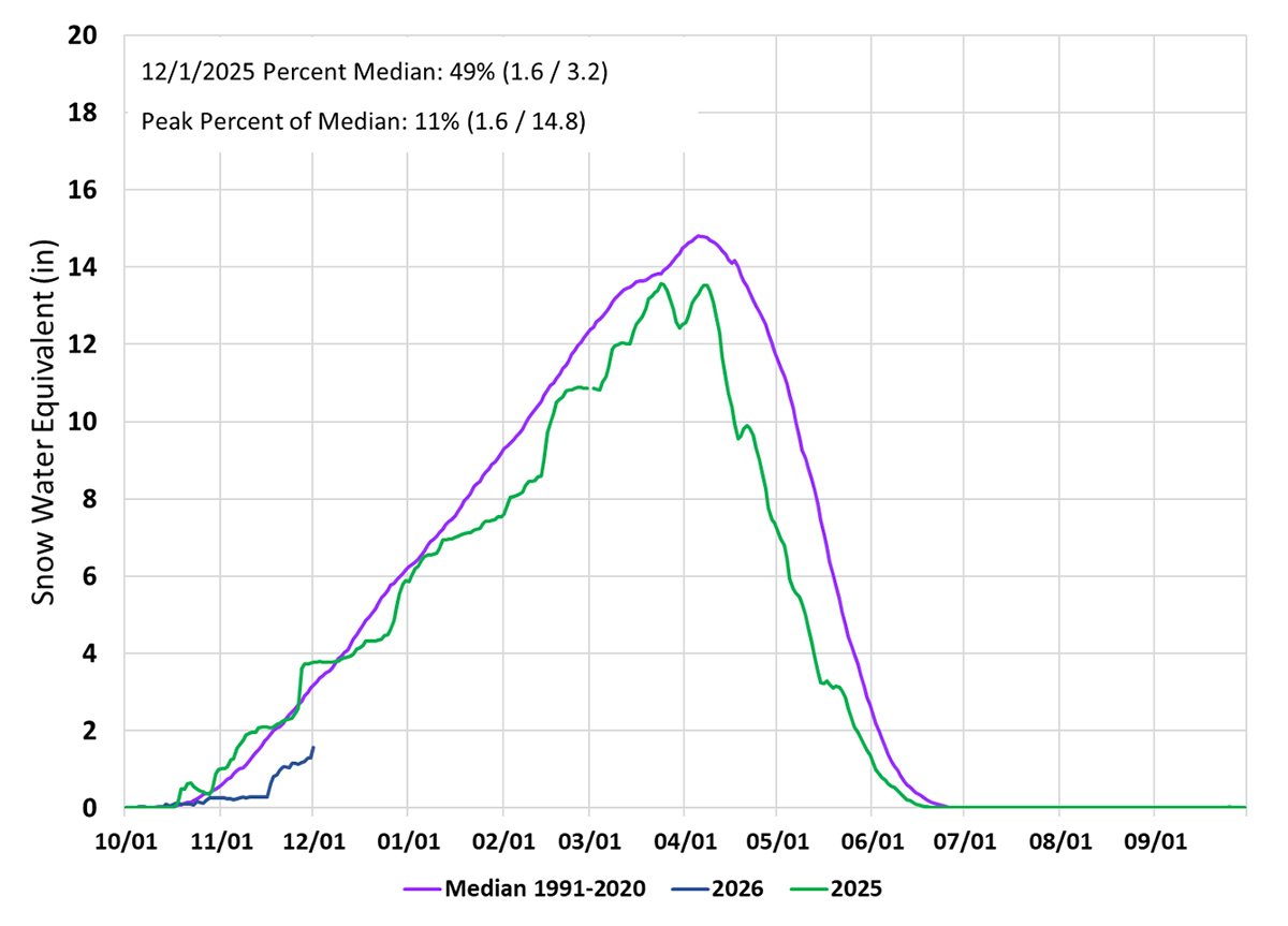 For the overall Colorado River Basin above Lake Powell, the snow accumulation as of 12/1/2025 is at 1.6 in., which is 49% of the 30-year median for this date of 3.2 in.